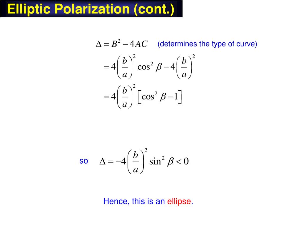 Elliptic Polarization (cont.) Collecting terms, we have or This is in the form of a quadratic expression: