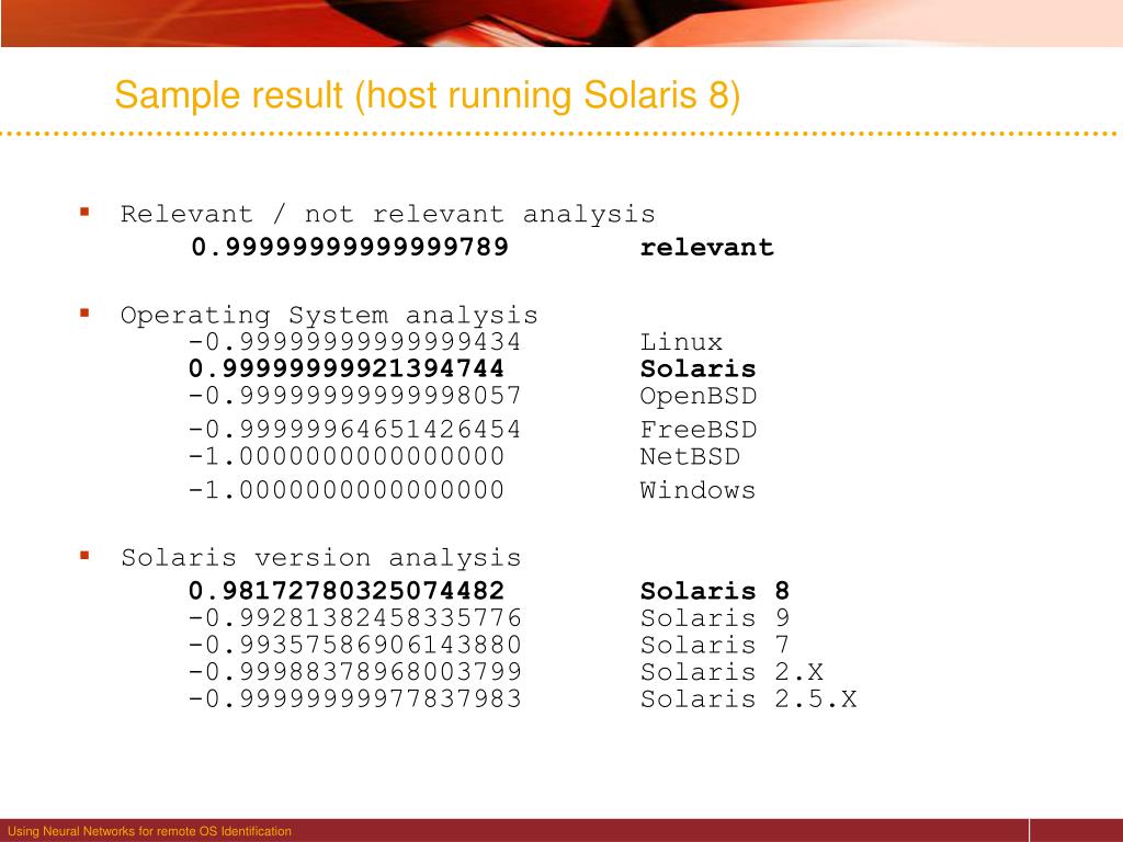 Sample result (host running Solaris 8) • Relevant / not relevant analysis 0.99999999999999789 relevant • Operating System analysis -0.99999999999999434 Linux 0.99999999921394744 Solaris -0.99999999999998057 OpenBSD -0.99999964651426454 FreeBSD -1.0000000000000000 NetBSD -1.0000000000000000 Windows • Solaris version analysis 0.98172780325074482 Solaris 8 -0.99281382458335776 Solaris 9 -0.99357586906143880 Solaris 7 -0.99988378968003799 Solaris 2.X -0.99999999977837983 Solaris 2.5.X