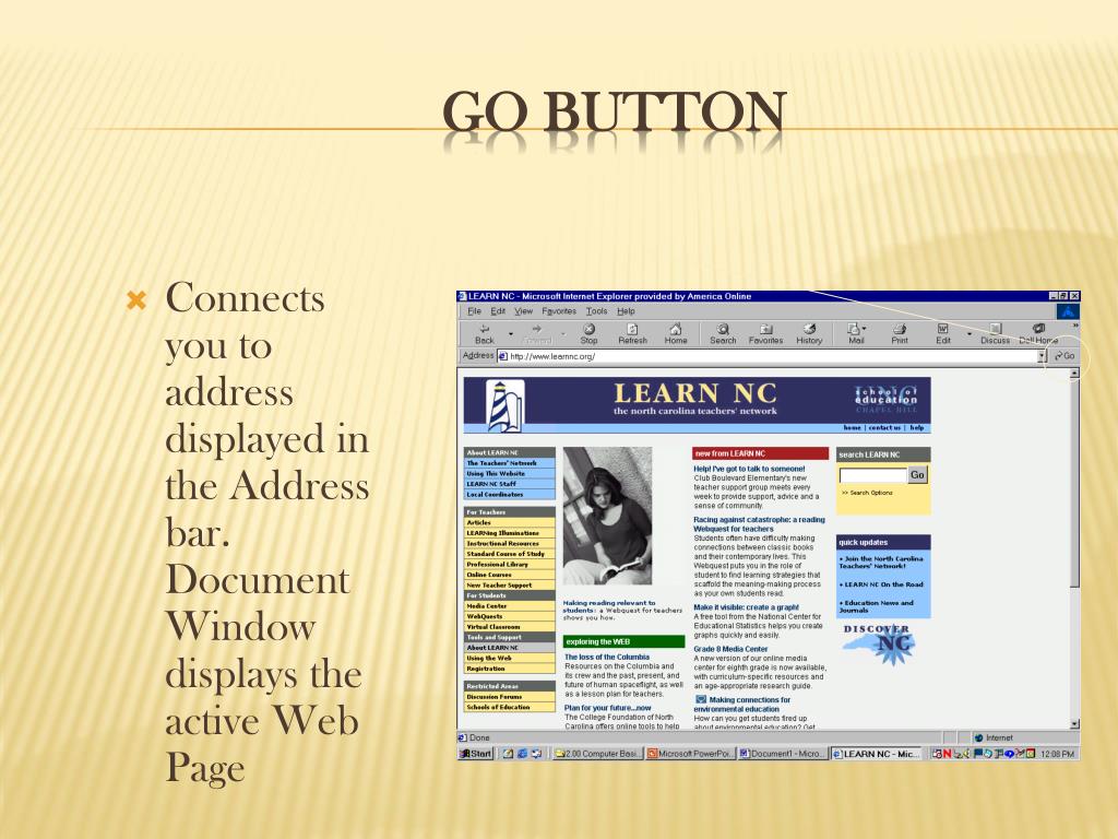 Connects you to address displayed in the Address bar. Document Window displays the active Web Page Go button