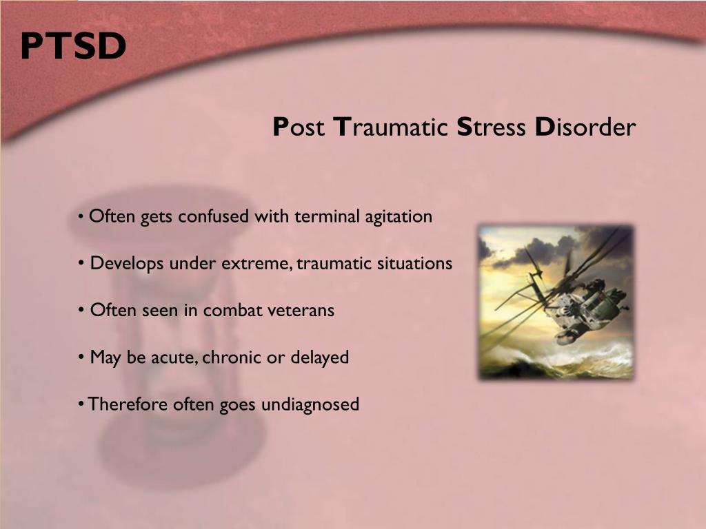 PTSD Post Traumatic Stress Disorder • Often gets confused with terminal agitation • Develops under extreme, traumatic situations • Often seen in combat veterans • May be acute, chronic or delayed • Therefore often goes undiagnosed