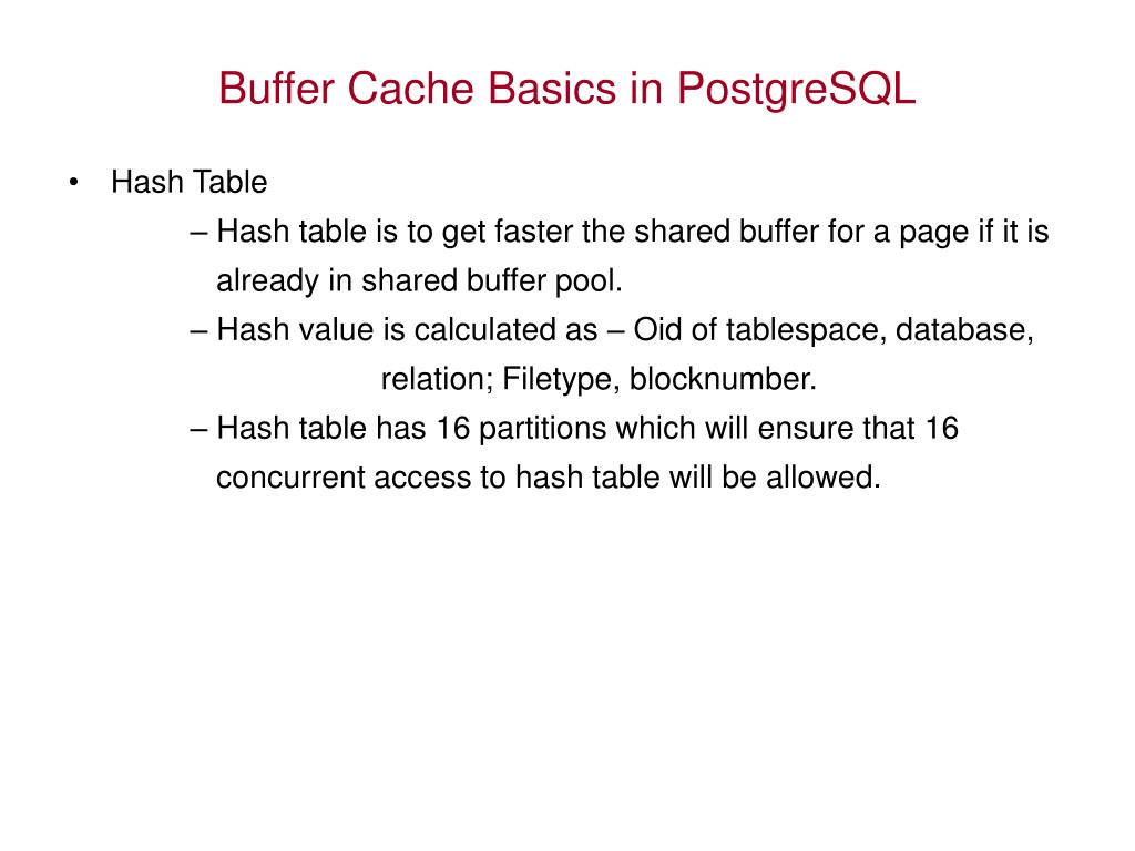 Buffer Cache Basics in PostgreSQL • Hash Table – Hash table is to get faster the shared buffer for a page if it is already in shared buffer pool. – Hash value is calculated as – Oid of tablespace, database, relation; Filetype, blocknumber. – Hash table has 16 partitions which will ensure that 16 concurrent access to hash table will be allowed.