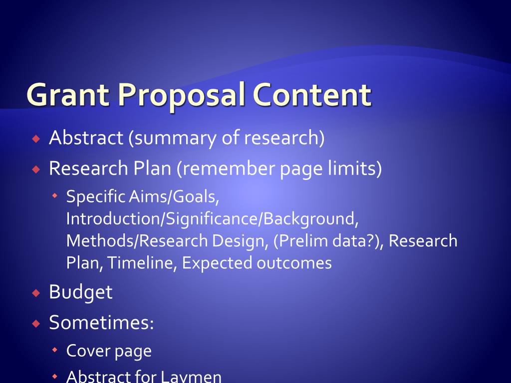 Grant Proposal Content • Abstract (summary of research) • Research Plan (remember page limits) • Specific Aims/Goals, Introduction/Significance/Background, Methods/Research Design, (Prelim data?), Research Plan, Timeline, Expected outcomes • Budget • Sometimes: • Cover page • Abstract for Laymen • Letters of Commitment • Biosketch of Proposed Mentor • Description of research environment