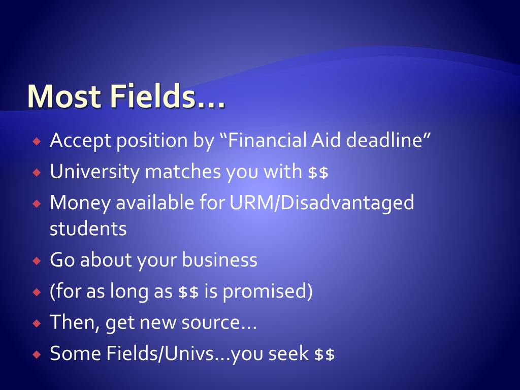 Most Fields… • Accept position by “Financial Aid deadline” • University matches you with $$ • Money available for URM/Disadvantaged students • Go about your business • (for as long as $$ is promised) • Then, get new source… • Some Fields/Univs…you seek $$