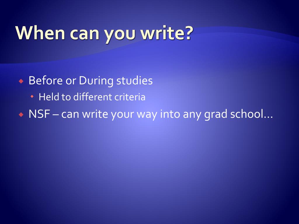 When can you write? • Before or During studies • Held to different criteria • NSF – can write your way into any grad school…