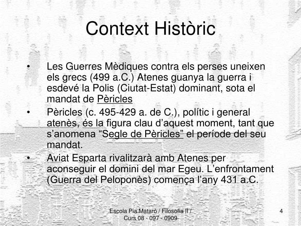 Context Històric • Les Guerres Mèdiques contra els perses uneixen els grecs (499 a.C.) Atenes guanya la guerra i esdevé la Polis (Ciutat-Estat) dominant, sota el mandat de Pèricles • Pèricles (c. 495-429 a. de C.), polític i general atenès, és la figura clau d’aquest moment, tant que s’anomena “Segle de Pèricles” el període del seu mandat. • Aviat Esparta rivalitzarà amb Atenes per aconseguir el domini del mar Egeu. L’enfrontament (Guerra del Peloponès) comença l’any 431 a.C. Escola Pia Mataró / Filosofia II / Curs 08 - 097 - 0909