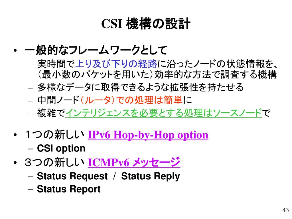 CSI 機構の設計 • 一般的なフレームワークとして • 実時間で上り及び下りの経路に沿ったノードの状態情報を、(最小数のパケットを用いた)効率的な方法で調査する機構 • 多様なデータに取得できるような拡張性を持たせる • 中間ノード(ルータ)での処理は簡単に • 複雑でインテリジェンスを必要とする処理はソースノードで • 1つの新しいIPv6 Hop-by-Hop option • CSI option • 3つの新しい ICMPv6 メッセージ • Status Request / Status Reply • Status Report