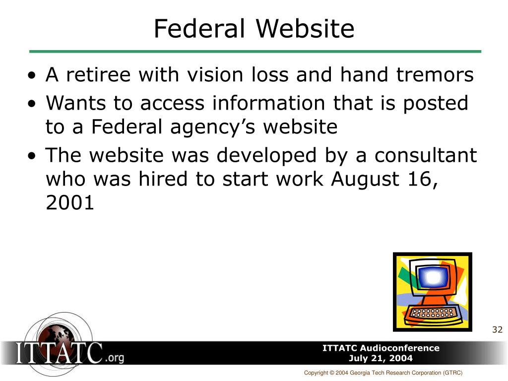 Federal Website • A retiree with vision loss and hand tremors • Wants to access information that is posted to a Federal agency’s website • The website was developed by a consultant who was hired to start work August 16, 2001