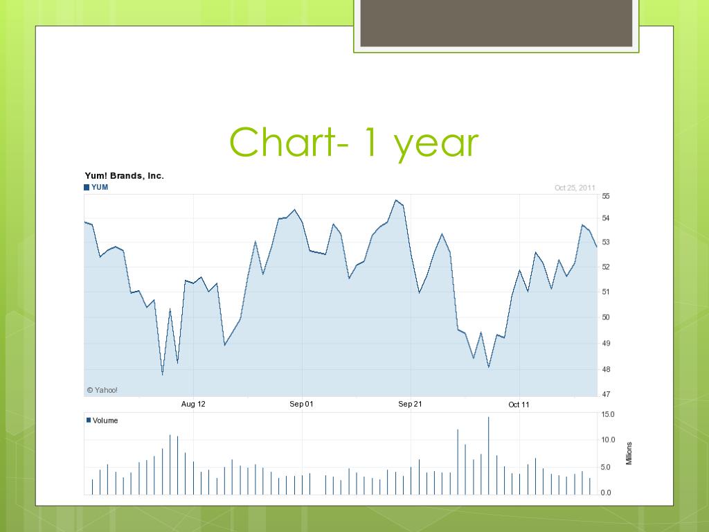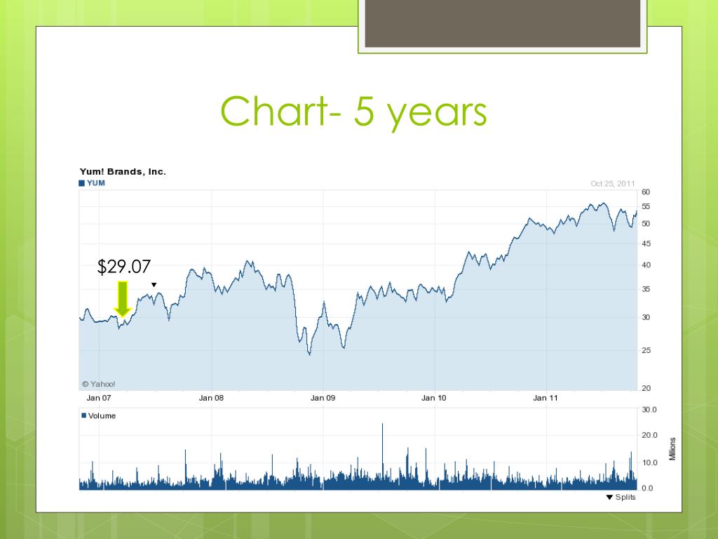 Recent News • October 2011- dividends go up by 14%, $.285 quarterly • Sept. 22, 2011- announced agreements to sell Long John Silver’s and A&W All-American Restaurants to two key franchisees (LJS Partners LLC and A Great American Brand LLC) • Strong international development with 331 new restaurants opened, including 138 new units in China • are now expecting to open 600 new units in China this year
