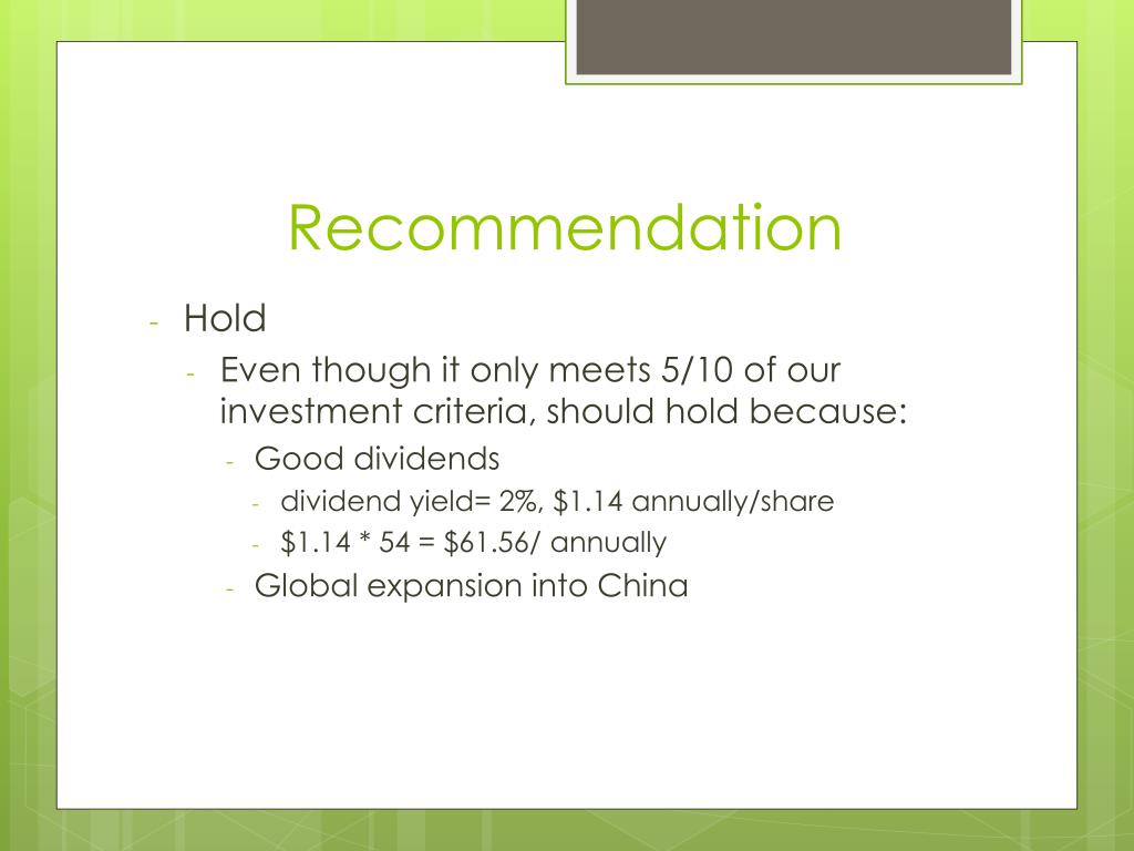 Recommendation • Hold • Even though it only meets 5/10 of our investment criteria, should hold because: • Good dividends • dividend yield= 2%, $1.14 annually/share • $1.14 * 54 = $61.56/ annually • Global expansion into China