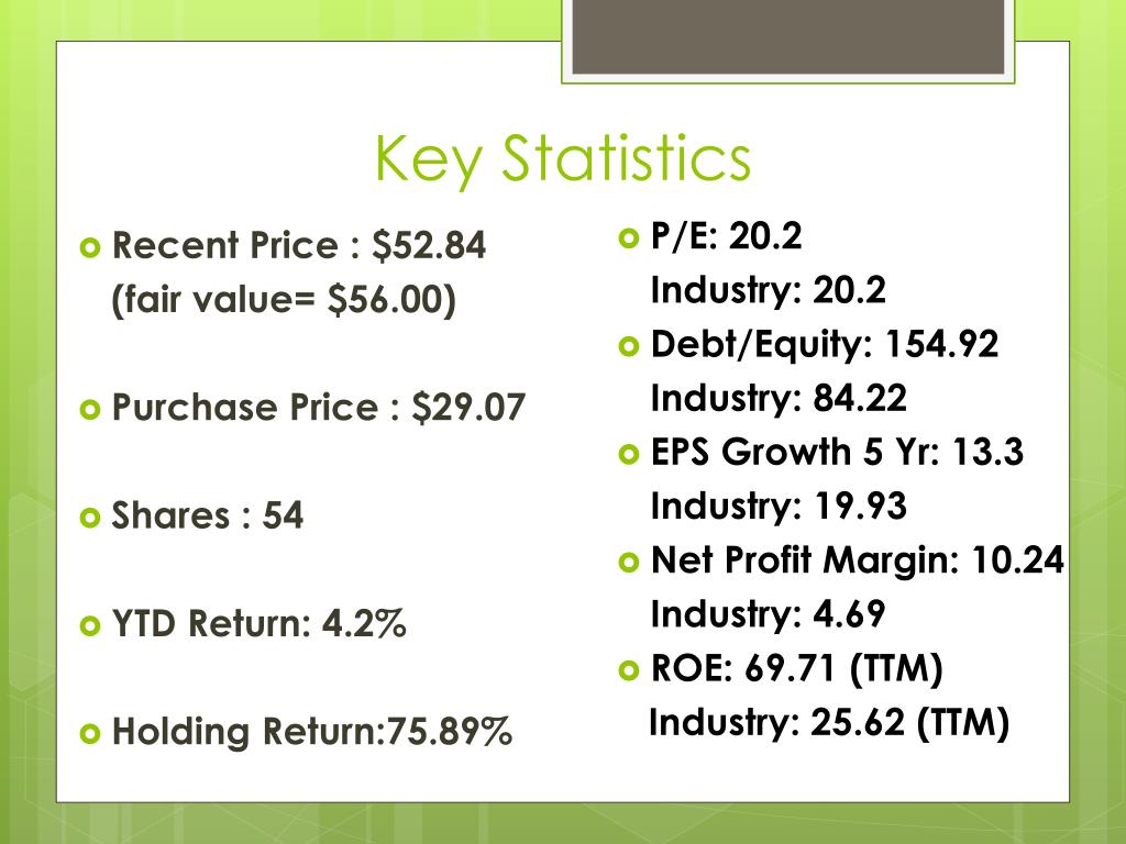 Key Statistics • P/E: 20.2 Industry: 20.2 • Debt/Equity: 154.92 Industry: 84.22 • EPS Growth 5 Yr: 13.3 Industry: 19.93 • Net Profit Margin: 10.24 Industry: 4.69 • ROE: 69.71 (TTM) Industry: 25.62 (TTM) • Recent Price : $52.84 (fair value= $56.00) • Purchase Price : $29.07 • Shares : 54 • YTD Return: 4.2% • Holding Return:75.89%