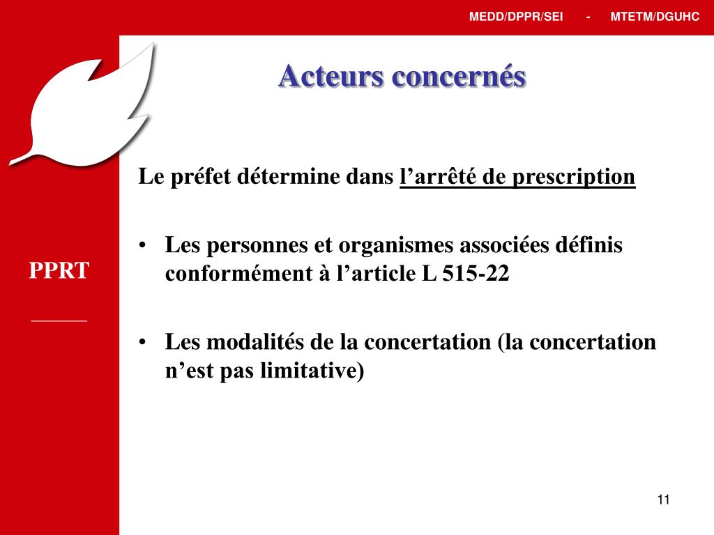 Acteurs concernés Le préfet détermine dans l’arrêté de prescription • Les personnes et organismes associées définis conformément à l’article L 515-22 • Les modalités de la concertation (la concertation n’est pas limitative)