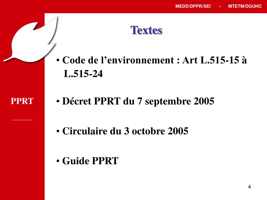 Textes • Code de l’environnement : Art L.515-15 à L.515-24 • Décret PPRT du 7 septembre 2005 • Circulaire du 3 octobre 2005 • Guide PPRT