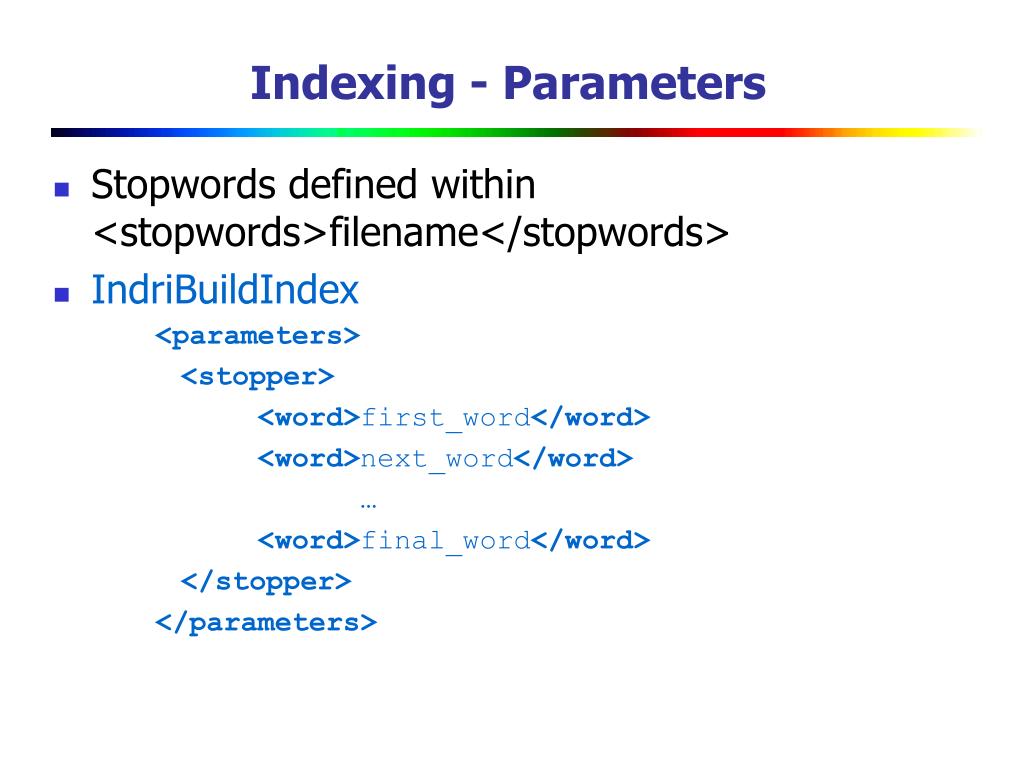 Indexing - Parameters • Stopwords defined within <stopwords>filename</stopwords> • IndriBuildIndex <parameters> <stopper> <word>first_word</word> <word>next_word</word> … <word>final_word</word> </stopper> </parameters>