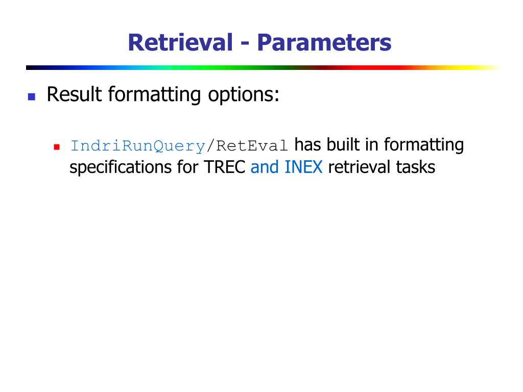 Retrieval - Parameters • Result formatting options: • IndriRunQuery/RetEval has built in formatting specifications for TREC and INEX retrieval tasks