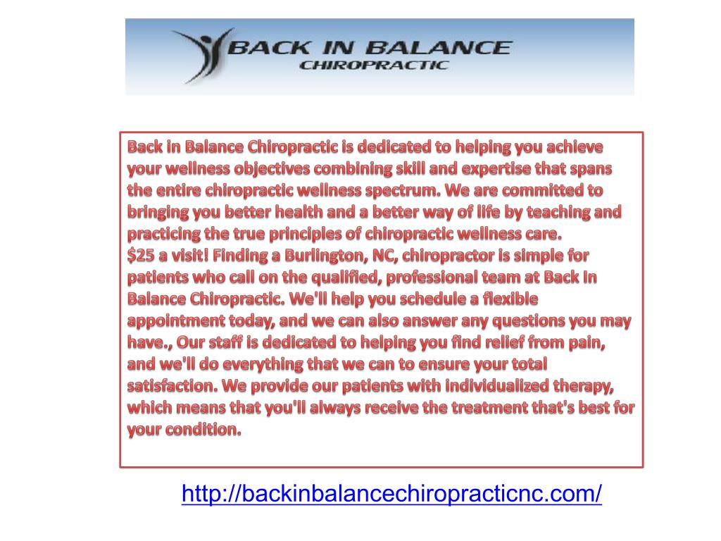 Back in Balance Chiropractic Back Pain, Chiropractic Care and Pregnancy Chiropractic - Burlington NC Back in Balance Chiropractic dedicated to helping achieve wellness objectives combining skill and expertise that spans the entire chiropractic wellness spectrum. Committed to bringing you better health and a better way of life by teaching and practicing the true principles of chiropractic wellness care. Chiropractor Burlington NC, Back Pain Burlington NC, Chiropractic Care Burlington NC, Chiropractic Center Burlington NC, Pregnancy Chiropractic Burlington NC http://backinbalancechiropracticnc.com/