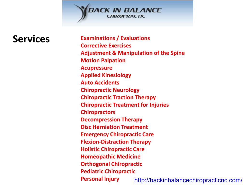 Services Examinations / Evaluations Corrective Exercises Adjustment & Manipulation of the Spine Motion Palpation Acupressure Applied Kinesiology Auto Accidents Chiropractic Neurology Chiropractic Traction Therapy Chiropractic Treatment for Injuries Chiropractors Decompression Therapy Disc Herniation Treatment Emergency Chiropractic Care Flexion-Distraction Therapy Holistic Chiropractic Care Homeopathic Medicine Orthogonal Chiropractic Pediatric Chiropractic Personal Injury • http://backinbalancechiropracticnc.com/