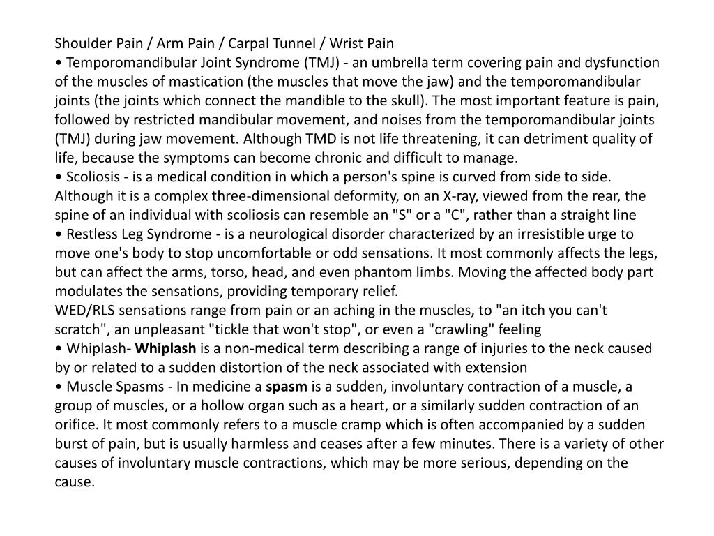 Shoulder Pain / Arm Pain / Carpal Tunnel / Wrist Pain • Temporomandibular Joint Syndrome (TMJ) - an umbrella term covering pain and dysfunction of the muscles of mastication (the muscles that move the jaw) and the temporomandibular joints (the joints which connect the mandible to the skull). The most important feature is pain, followed by restricted mandibular movement, and noises from the temporomandibular joints (TMJ) during jaw movement. Although TMD is not life threatening, it can detriment quality of life, because the symptoms can become chronic and difficult to manage. • Scoliosis - is a medical condition in which a person's spine is curved from side to side. Although it is a complex three-dimensional deformity, on an X-ray, viewed from the rear, the spine of an individual with scoliosis can resemble an "S" or a "C", rather than a straight line • Restless Leg Syndrome - is a neurological disorder characterized by an irresistible urge to move one's body to stop uncomfortable or odd sensations. It most commonly affects the legs, but can affect the arms, torso, head, and even phantom limbs. Moving the affected body part modulates the sensations, providing temporary relief. WED/RLS sensations range from pain or an aching in the muscles, to "an itch you can't scratch", an unpleasant "tickle that won't stop", or even a "crawling" feeling • Whiplash- Whiplash is a non-medical term describing a range of injuries to the neck caused by or related to a sudden distortion of the neck associated with extension • Muscle Spasms - In medicine a spasm is a sudden, involuntary contraction of a muscle, a group of muscles, or a hollow organ such as a heart, or a similarly sudden contraction of an orifice. It most commonly refers to a muscle cramp which is often accompanied by a sudden burst of pain, but is usually harmless and ceases after a few minutes. There is a variety of other causes of involuntary muscle contractions, which may be more serious, depending on the cause.