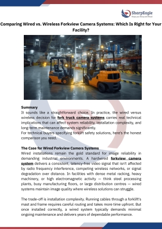 Comparing Wired vs. Wireless Forkview Camera Systems: Which Is Right for Your Facility? Summary It sounds like a straightforward choice. In practice, the wired versus wireless decision for fork truck camera systems carries real technical implications that can affect system reliability, installation complexity, and long-term maintenance demands significantly. For technical buyers specifying forklift safety solutions, here's the honest comparison you need. The Case for Wired Forkview Camera Systems Wired installations remain the gold standard for image reliability in demanding industrial environments. A hardwired forkview camera system delivers a consistent, latency-free video signal that isn't affected by radio frequency interference, competing wireless networks, or signal degradation over distance. In facilities with dense metal racking, heavy machinery, or high electromagnetic activity — think steel processing plants, busy manufacturing floors, or large distribution centres — wired systems maintain image quality where wireless solutions can struggle. The trade-off is installation complexity. Running cables through a forklift's mast and frame requires careful routing and takes more time upfront. But once installed correctly, a wired system typically demands minimal ongoing maintenance and delivers years of dependable performance.