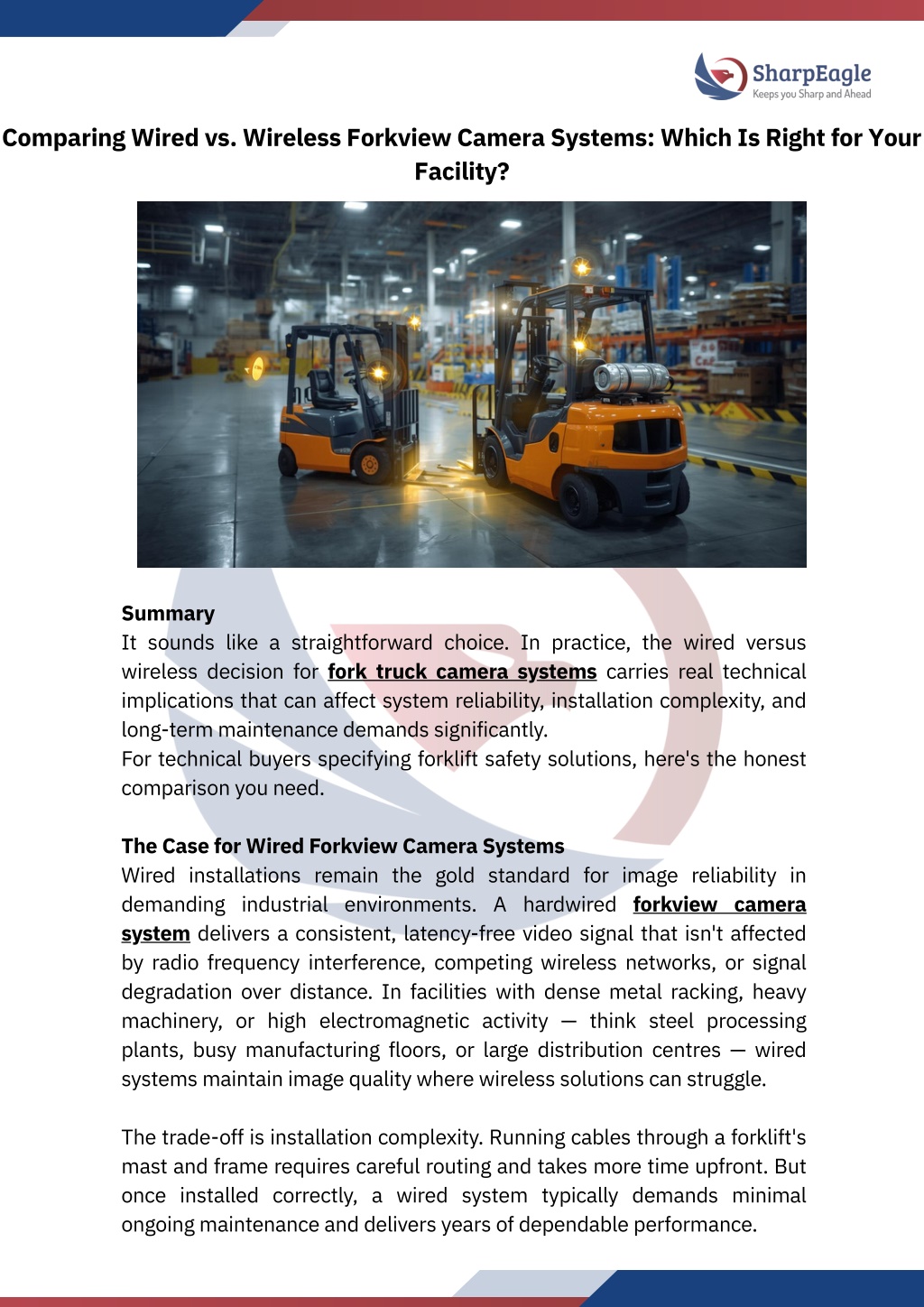 Wireless solutions suit smaller fleets, facilities with straightforward RF environments, operations requiring rapid deployment across multiple sites, and scenarios where installation flexibility outweighs the marginal reliability advantage of wired alternatives. The honest answer for most technical buyers is that the right choice depends on your specific facility conditions — not a universal preference for one technology over the other. SharpEagle's Approach SharpEagle offers both wired and wireless forkview camera configurations, engineered for industrial-grade performance across the full range of facility types. Our technical team works directly with buyers to assess your environment, fleet size, and operational requirements — recommending the configuration that delivers the best long-term reliability for your specific conditions across the UK, UAE, and Kuwait. Not sure whether wired or wireless is the right fit for your facility? Speak with SharpEagle's technical specialists for an expert assessment and tailored recommendation today. To explore the broader landscape of forklift safety technology and make fully informed procurement decisions, have you read ourComplete Guide to Forklift Safety Solutions – Types, Regulations & Best Practices— because when the technical details matter this much, wouldn't you want every factor considered before you commit? Contact Us: SharpEagle Phone: +971-45549547 Email: sales@sharpeagle.com Web: https://sharpeagle.com/
