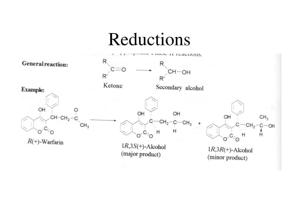 Reductions • Less common than oxidations • Usually specific enzymes, e.g. aldo-keto reductases, nitro reductases • C=O alcohols • NO2 NH2 • N=N 2 NH2
