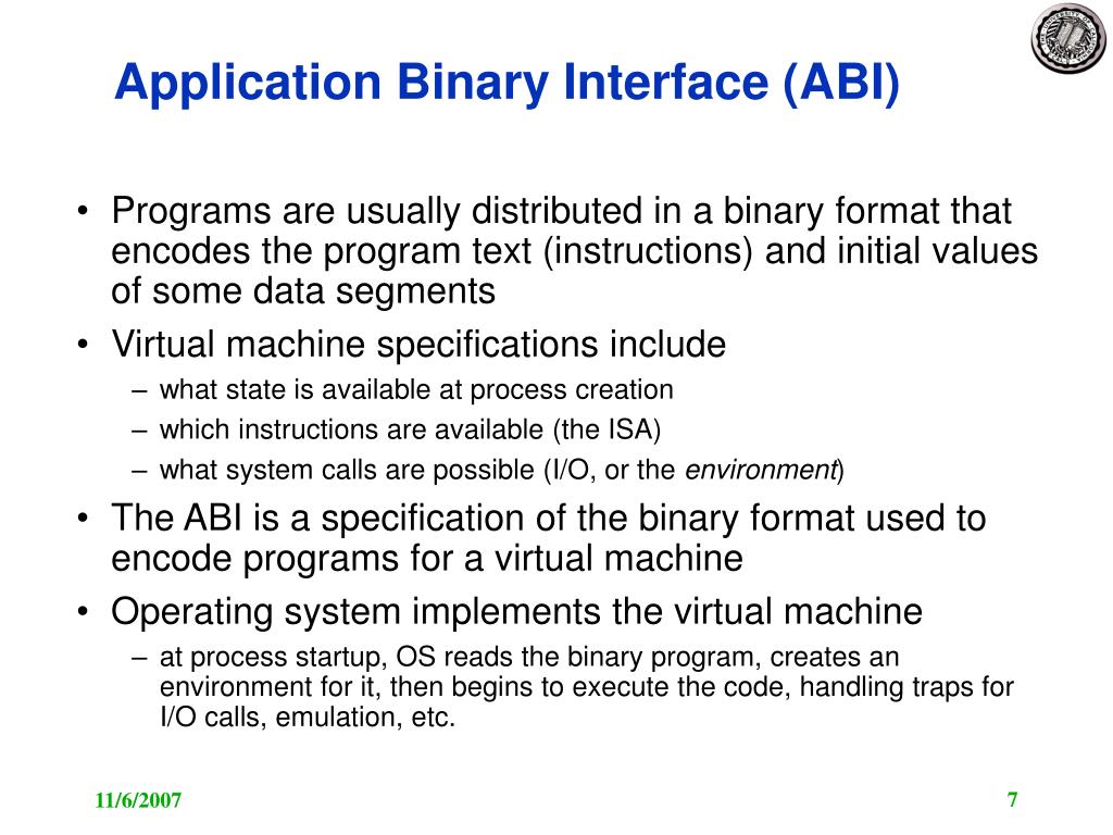 Application Binary Interface (ABI) • Programs are usually distributed in a binary format that encodes the program text (instructions) and initial values of some data segments • Virtual machine specifications include • what state is available at process creation • which instructions are available (the ISA) • what system calls are possible (I/O, or the environment) • The ABI is a specification of the binary format used to encode programs for a virtual machine • Operating system implements the virtual machine • at process startup, OS reads the binary program, creates an environment for it, then begins to execute the code, handling traps for I/O calls, emulation, etc.