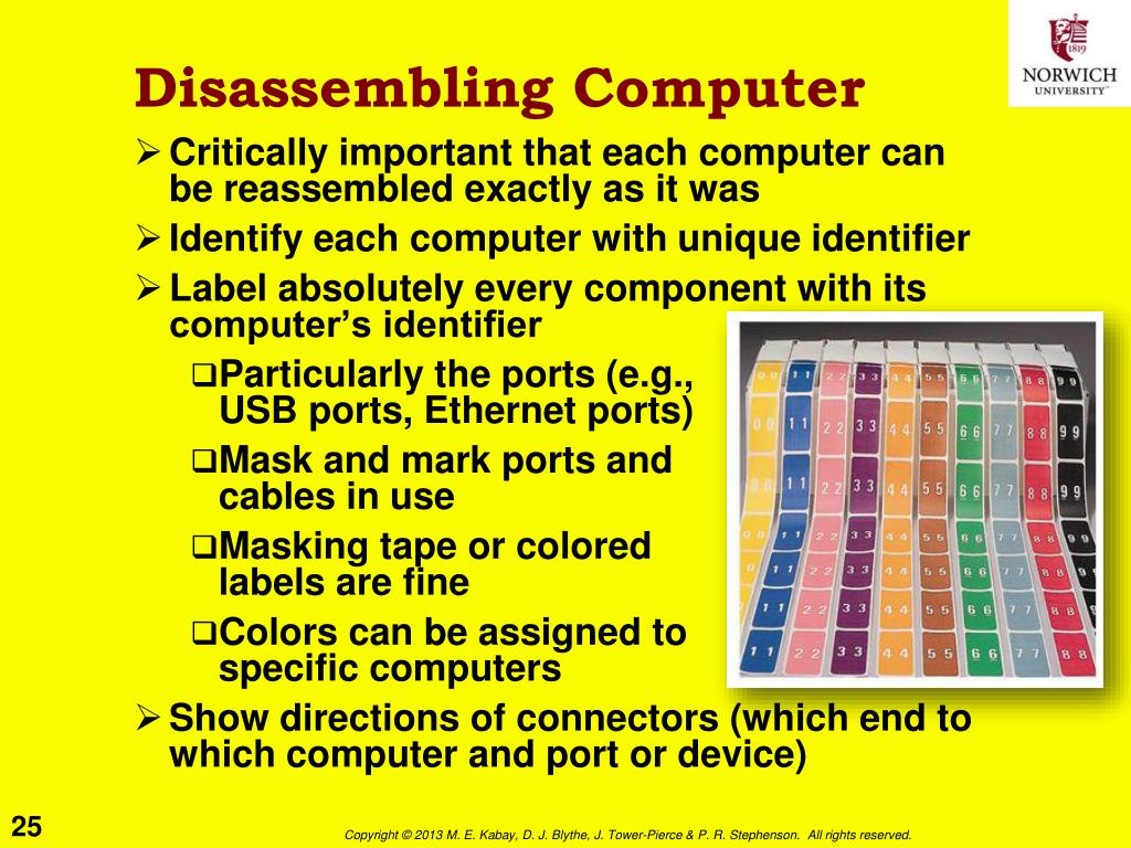Disassembling Computer • Critically important that each computer can be reassembled exactly as it was • Identify each computer with unique identifier • Label absolutely every component with its computer’s identifier • Particularly the ports (e.g.,USB ports, Ethernet ports) • Mask and mark ports andcables in use • Masking tape or colored labels are fine • Colors can be assigned to specific computers • Show directions of connectors (which end to which computer and port or device)