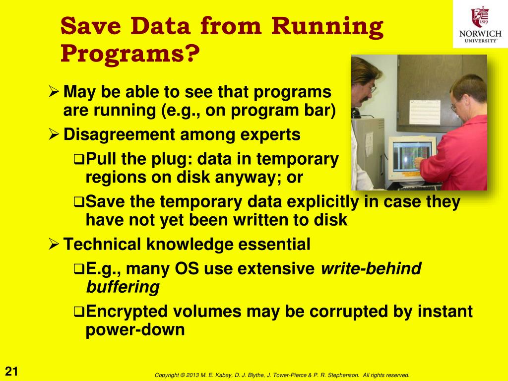 Save Data from Running Programs? • May be able to see that programs are running (e.g., on program bar) • Disagreement among experts • Pull the plug: data in temporary regions on disk anyway; or • Save the temporary data explicitly in case they have not yet been written to disk • Technical knowledge essential • E.g., many OS use extensive write-behind buffering • Encrypted volumes may be corrupted by instant power-down