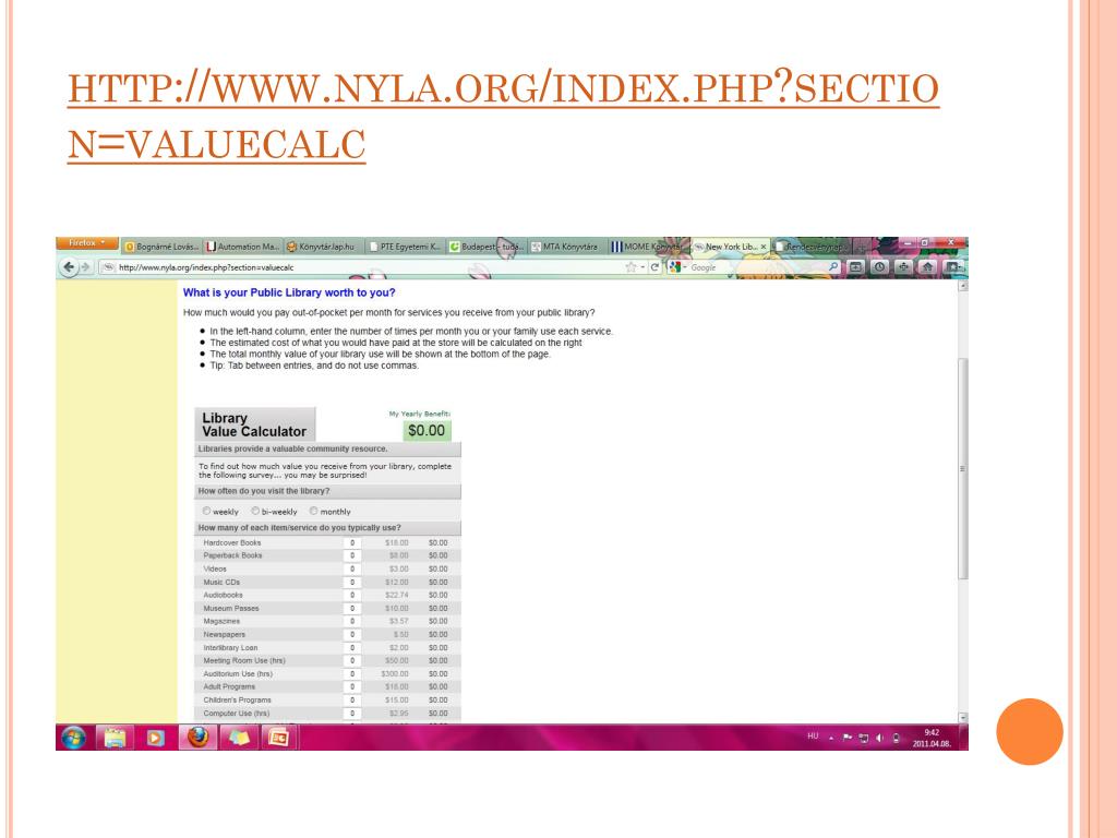 Mennyit ér a könyvtár?. http://www.ala.org/ala/research/librarystats/roi/index.cfm. http://www.nyla.org/index.php?section=valuecalc. http://www.maine.gov/msl/services/calexplantion.htm. http://research.library.cornell.edu/value. Outputs and outcomes.