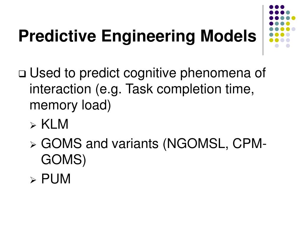 Predictive Engineering Models • Used to predict cognitive phenomena of interaction (e.g. Task completion time, memory load) • KLM • GOMS and variants (NGOMSL, CPM-GOMS) • PUM