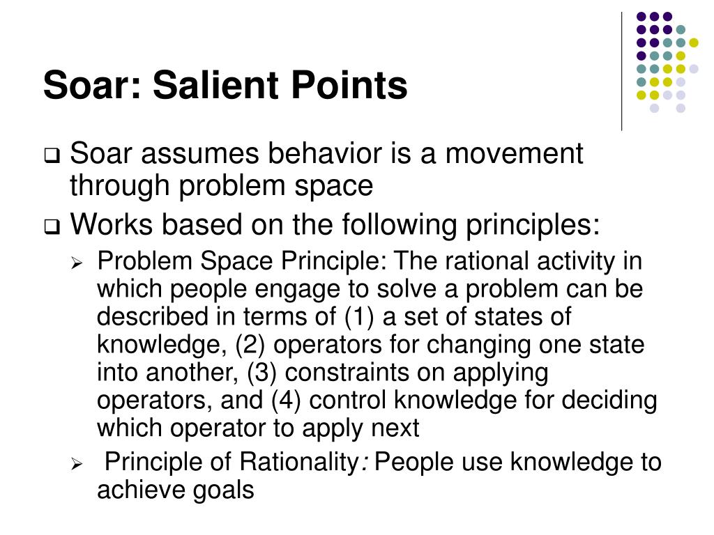 Soar: Salient Points • Soar assumes behavior is a movement through problem space • Works based on the following principles: • Problem Space Principle: The rational activity in which people engage to solve a problem can be described in terms of (1) a set of states of knowledge, (2) operators for changing one state into another, (3) constraints on applying operators, and (4) control knowledge for deciding which operator to apply next • Principle of Rationality: People use knowledge to achieve goals