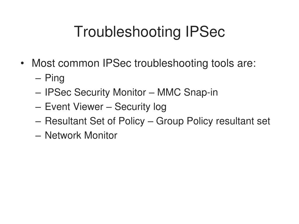 Troubleshooting IPSec • Most common IPSec troubleshooting tools are: • Ping • IPSec Security Monitor – MMC Snap-in • Event Viewer – Security log • Resultant Set of Policy – Group Policy resultant set • Network Monitor