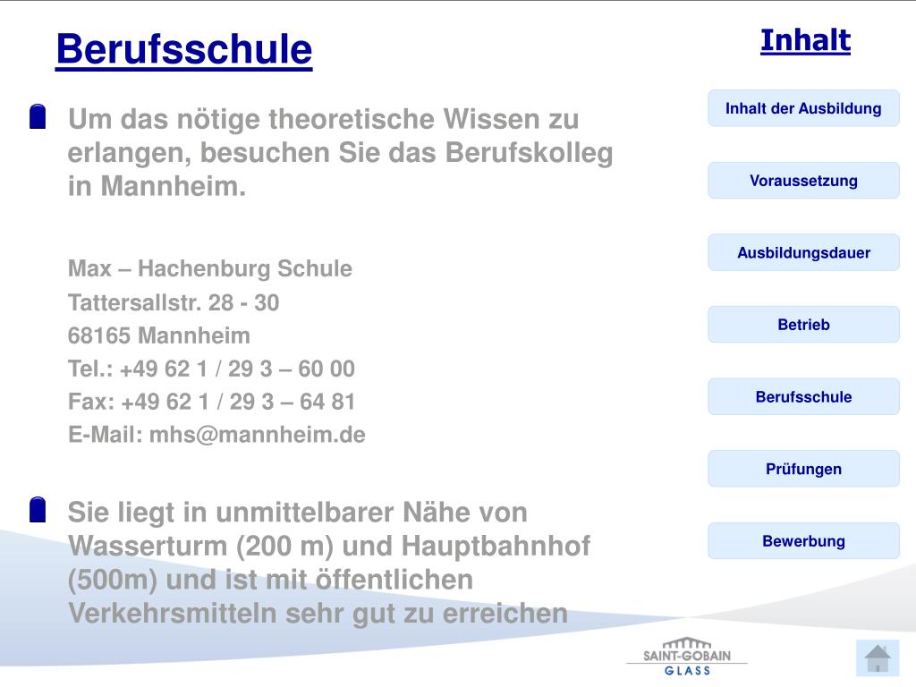 Um das nötige theoretische Wissen zu erlangen, besuchen Sie das Berufskolleg in Mannheim. Max – Hachenburg Schule Tattersallstr. 28 - 30 68165 Mannheim Tel.: +49 62 1 / 29 3 – 60 00 Fax: +49 62 1 / 29 3 – 64 81 E-Mail: mhs@mannheim.de Sie liegt in unmittelbarer Nähe von Wasserturm (200 m) und Hauptbahnhof (500m) und ist mit öffentlichen Verkehrsmitteln sehr gut zu erreichen Berufsschule