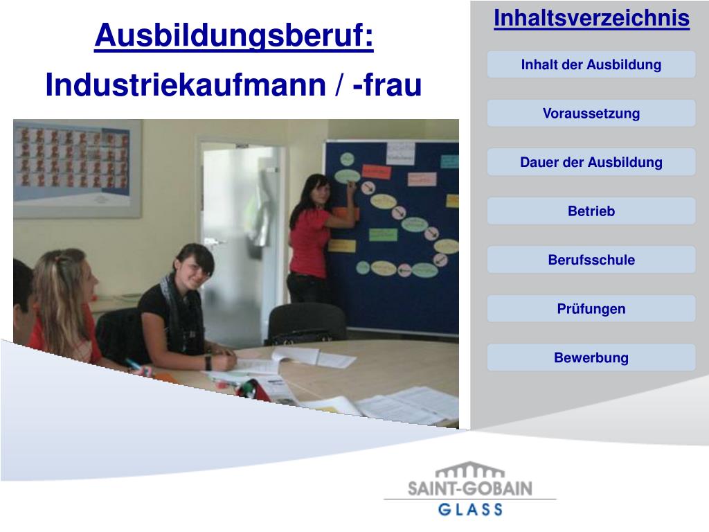 Materialwirtschaft Organisation der Materialwirtschaft Einkauf Warenannahme und Warenprüfung Rechnungsprüfung Lagerung von Roh-, Hilfs- und Betriebsstoffen Materialverwaltung Produktionswirtschaft Organisation der Produktionswirtschaft Fertigung und Fertigungsplanung Personalwesen Organisation des Personalwesens Einstellen und Ausscheiden von Arbeitnehmern Personalverwaltung Berufsbildung im Ausbildungsbetrieb Arbeitsschutz und Unfallverhütung Lohn- und Gehaltsabrechnung Absatzwirtschaft Organisation der Absatzwirtschaft Inhalt der Ausbildung