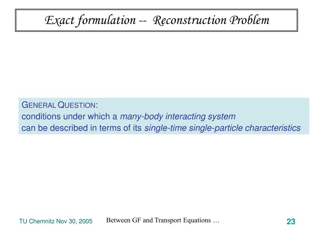 Exact formulation -- Reconstruction Problem GENERAL QUESTION: conditions under which a many-body interacting system can be described in terms of its single-time single-particle characteristics Between GF and Transport Equations …