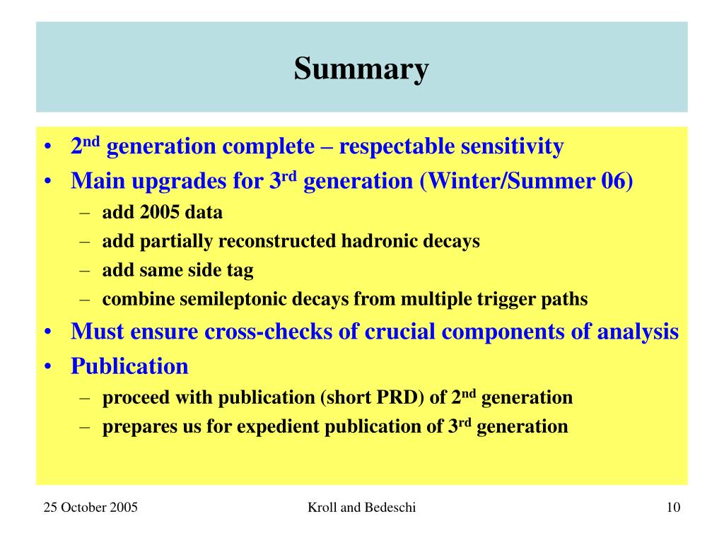 Summary • 2nd generation complete – respectable sensitivity • Main upgrades for 3rd generation (Winter/Summer 06) • add 2005 data • add partially reconstructed hadronic decays • add same side tag • combine semileptonic decays from multiple trigger paths • Must ensure cross-checks of crucial components of analysis • Publication • proceed with publication (short PRD) of 2nd generation • prepares us for expedient publication of 3rd generation Kroll and Bedeschi