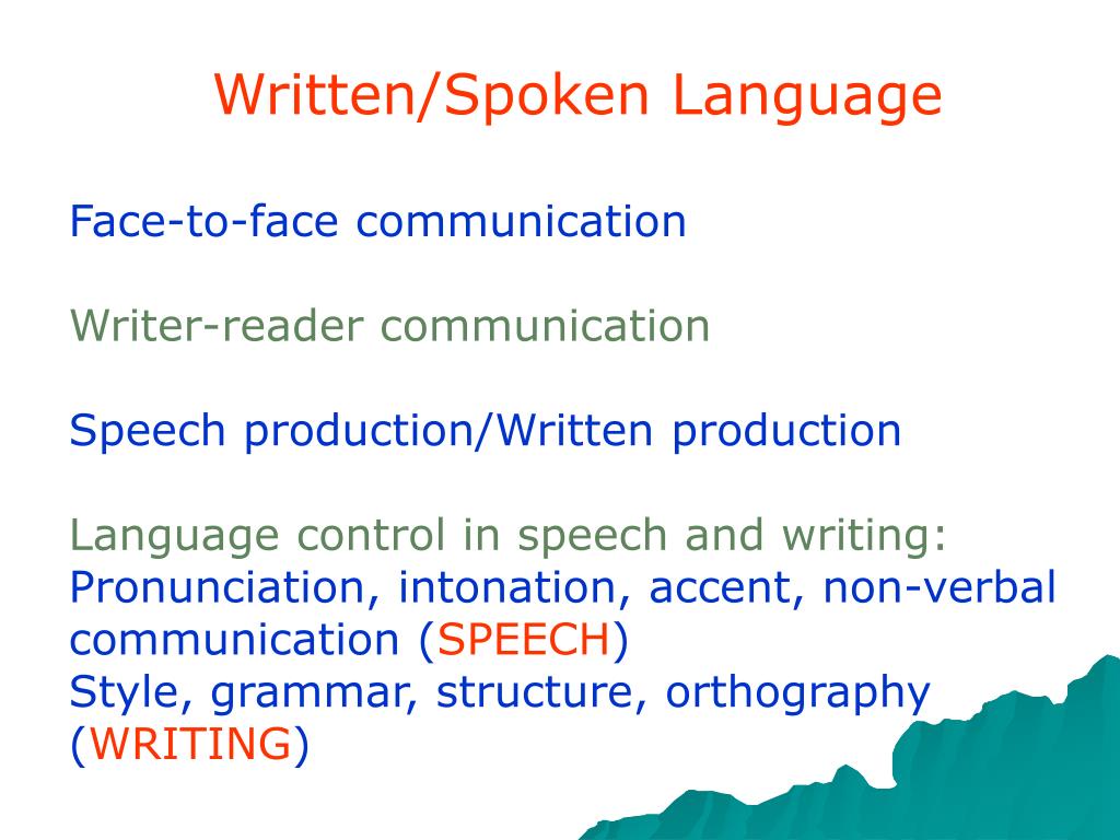 Written/Spoken Language • Face-to-face communication • Writer-reader communication • Speech production/Written production • Language control in speech and writing: Pronunciation, intonation, accent, non-verbal communication (SPEECH) • Style, grammar, structure, orthography (WRITING)