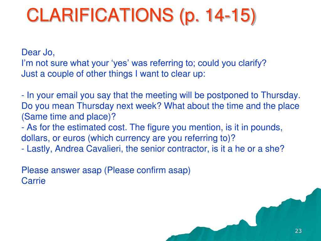 CLARIFICATIONS (p. 14-15)Dear Jo,I’m not sure what your ‘yes’ was referring to; could you clarify?Just a couple of other things I want to clear up:- In your email you say that the meeting will be postponed to Thursday.Do you mean Thursday next week? What about the time and the place (Same time and place)?- As for the estimated cost. The figure you mention, is it in pounds, dollars, or euros (which currency are you referring to)?- Lastly, Andrea Cavalieri, the senior contractor, is it a he or a she?Please answer asap (Please confirm asap)Carrie