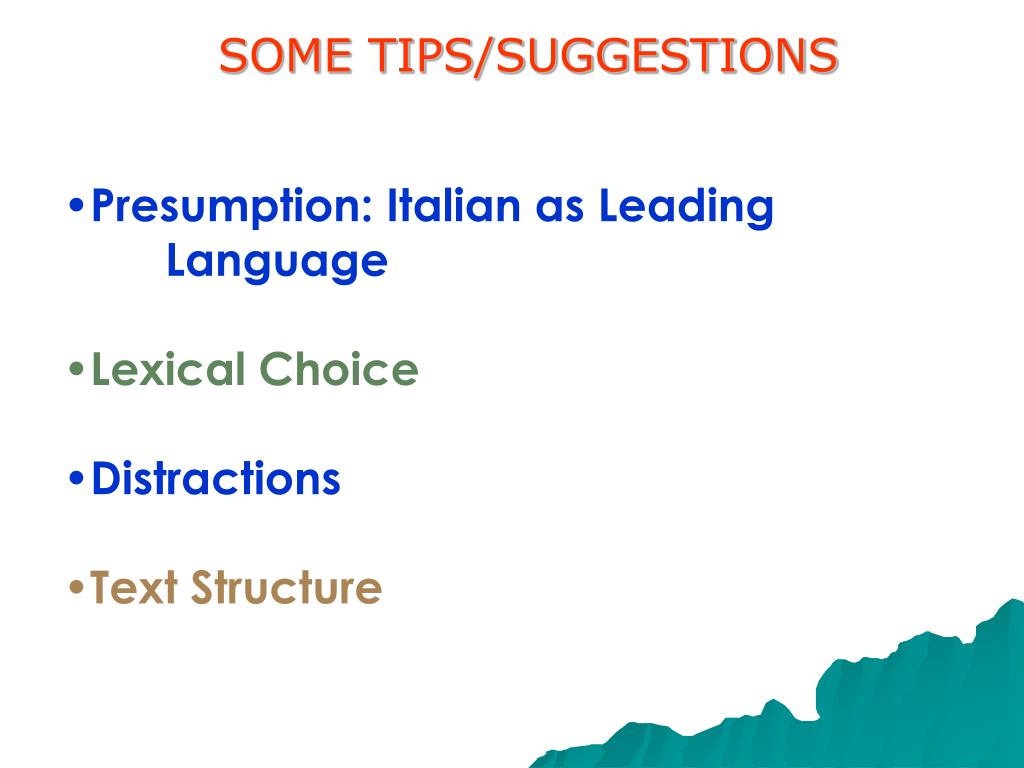SOME TIPS/SUGGESTIONS • Presumption: Italian as Leading Language • Lexical Choice • Distractions • Text Structure