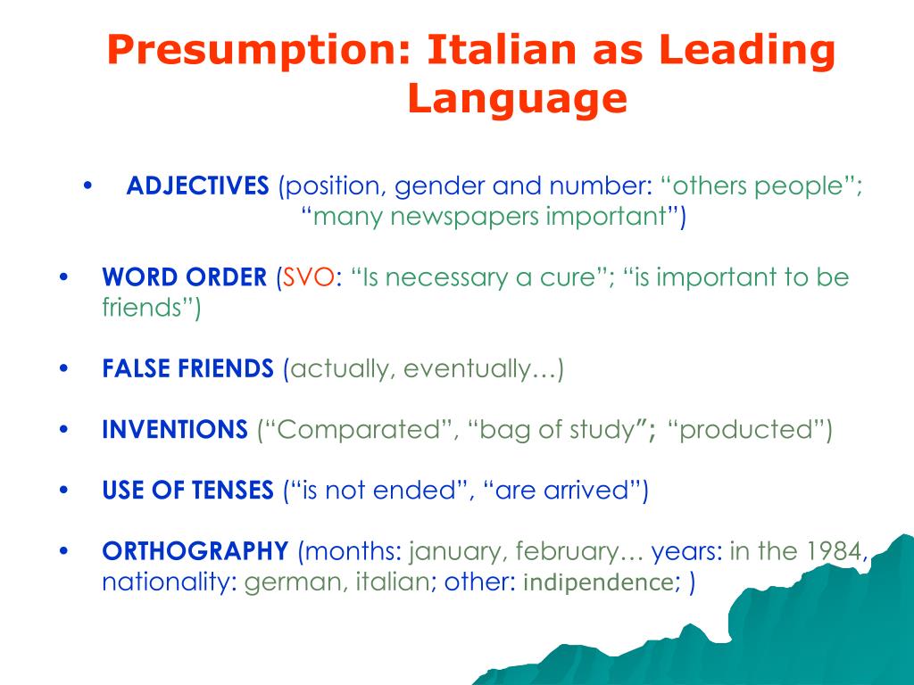 Presumption: Italian as Leading Language • ADJECTIVES (position, gender and number: “others people”; “many newspapers important”) • WORD ORDER (SVO: “Is necessary a cure”; “is important to be friends”) • FALSE FRIENDS (actually, eventually…) • INVENTIONS (“Comparated”, “bag of study”; “producted”) • USE OF TENSES (“is not ended”, “are arrived”) • ORTHOGRAPHY (months: january, february… years: in the 1984, nationality: german, italian; other: indipendence; )