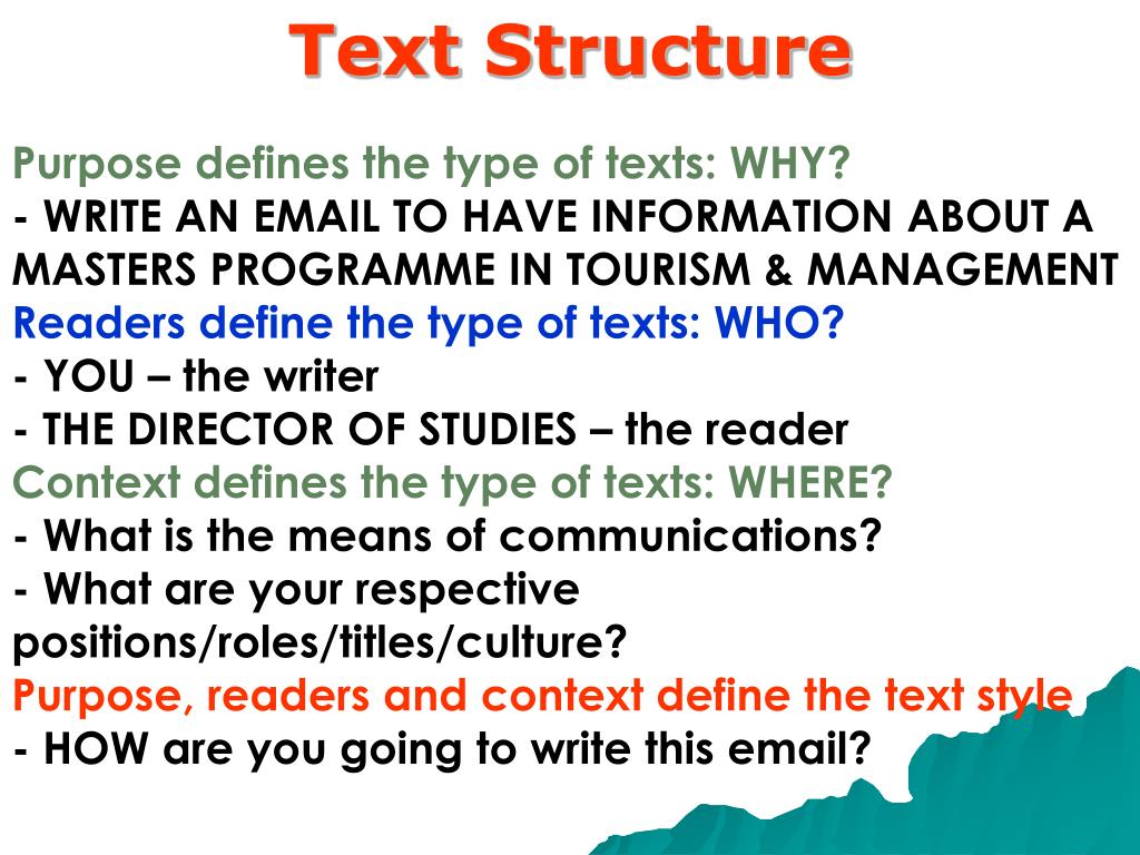 Text Structure Purposedefines the typeoftexts: WHY? - WRITE AN EMAIL TO HAVE INFORMATION ABOUT A MASTERS PROGRAMME IN TOURISM & MANAGEMENT Readersdefine the typeoftexts: WHO? - YOU – the writer - THE DIRECTOR OF STUDIES – the reader Contextdefines the typeoftexts: WHERE? - Whatis the meansofcommunications? - What are yourrespectivepositions/roles/titles/culture? Purpose, readers and contextdefine the text style - HOW are yougoingtowritethisemail?