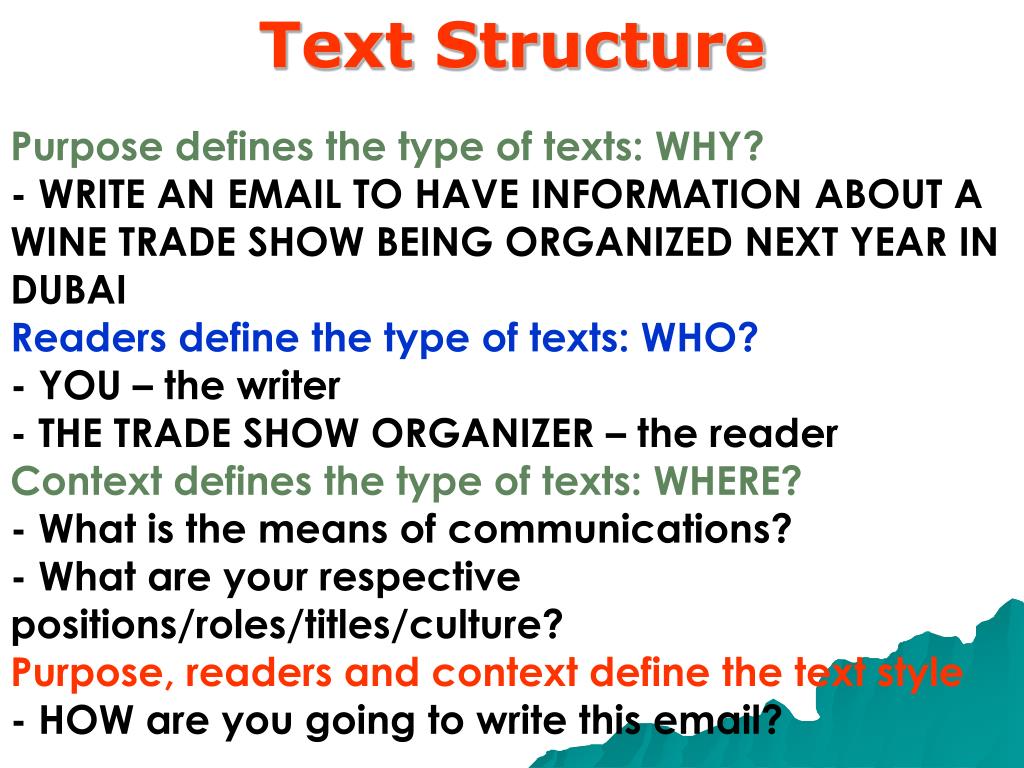 Text Structure Purpose defines the type of texts: WHY? - WRITE AN EMAIL TO HAVE INFORMATION ABOUT A WINE TRADE SHOW BEING ORGANIZED NEXT YEAR IN DUBAI Readers define the type of texts: WHO? - YOU – the writer - THE TRADE SHOW ORGANIZER – the reader Context defines the type of texts: WHERE? - What is the means of communications? - What are your respective positions/roles/titles/culture? Purpose, readers and context define the text style - HOW are you going to write this email?