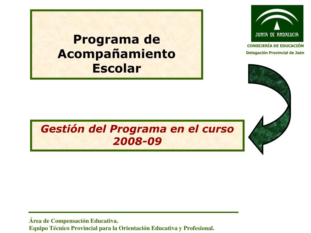 Programa de Acompañamiento Escolar. CONSEJERÍA DE EDUCACIÓN Delegación Provincial de Jaén. Gestión del Programa en el curso 2008-09. Área de Compensación Educativa. Equipo Técnico Provincial para la Orientación Educativa y Profesional. PROGRAMA DE ACOMPAÑAMIENTO ESCOLAR.