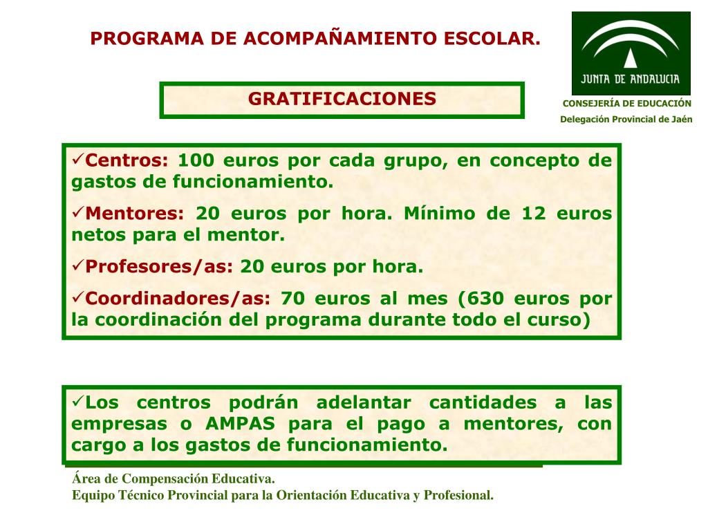 PROGRAMA DE ACOMPAÑAMIENTO ESCOLAR. GRATIFICACIONES CONSEJERÍA DE EDUCACIÓN Delegación Provincial de Jaén • Centros: 100 euros por cada grupo, en concepto de gastos de funcionamiento. • Mentores: 20 euros por hora. Mínimo de 12 euros netos para el mentor. • Profesores/as: 20 euros por hora. • Coordinadores/as: 70 euros al mes (630 euros por la coordinación del programa durante todo el curso) • Los centros podrán adelantar cantidades a las empresas o AMPAS para el pago a mentores, con cargo a los gastos de funcionamiento. Área de Compensación Educativa. Equipo Técnico Provincial para la Orientación Educativa y Profesional.