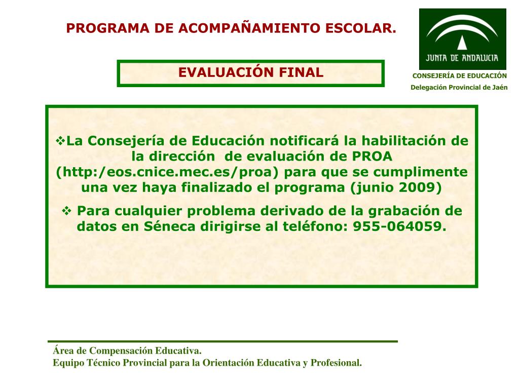 PROGRAMA DE ACOMPAÑAMIENTO ESCOLAR. EVALUACIÓN FINAL CONSEJERÍA DE EDUCACIÓN Delegación Provincial de Jaén • La Consejería de Educación notificará la habilitación de la dirección de evaluación de PROA (http:/eos.cnice.mec.es/proa) para que se cumplimente una vez haya finalizado el programa (junio 2009) • Para cualquier problema derivado de la grabación de datos en Séneca dirigirse al teléfono: 955-064059. Área de Compensación Educativa. Equipo Técnico Provincial para la Orientación Educativa y Profesional.