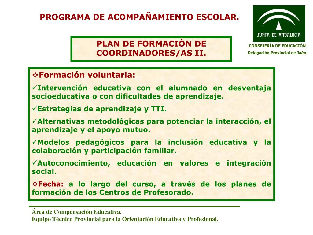PROGRAMA DE ACOMPAÑAMIENTO ESCOLAR. PLAN DE FORMACIÓN DE COORDINADORES/AS II. CONSEJERÍA DE EDUCACIÓN Delegación Provincial de Jaén • Formación voluntaria: • Intervención educativa con el alumnado en desventaja socioeducativa o con dificultades de aprendizaje. • Estrategias de aprendizaje y TTI. • Alternativas metodológicas para potenciar la interacción, el aprendizaje y el apoyo mutuo. • Modelos pedagógicos para la inclusión educativa y la colaboración y participación familiar. • Autoconocimiento, educación en valores e integración social. • Fecha: a lo largo del curso, a través de los planes de formación de los Centros de Profesorado. Área de Compensación Educativa. Equipo Técnico Provincial para la Orientación Educativa y Profesional.