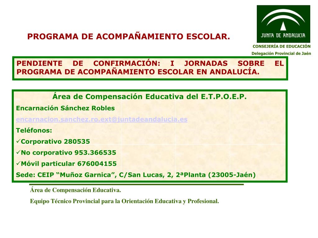 PROGRAMA DE ACOMPAÑAMIENTO ESCOLAR. CONSEJERÍA DE EDUCACIÓN Delegación Provincial de Jaén PENDIENTE DE CONFIRMACIÓN: I JORNADAS SOBRE EL PROGRAMA DE ACOMPAÑAMIENTO ESCOLAR EN ANDALUCÍA. Área de Compensación Educativa del E.T.P.O.E.P. Encarnación Sánchez Robles encarnacion.sanchez.ro.ext@juntadeandalucia.es Teléfonos: • Corporativo 280535 • No corporativo 953.366535 • Móvil particular 676004155 Sede: CEIP “Muñoz Garnica”, C/San Lucas, 2, 2ªPlanta (23005-Jaén) Área de Compensación Educativa. Equipo Técnico Provincial para la Orientación Educativa y Profesional.