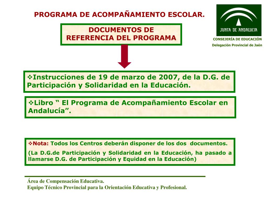 PROGRAMA DE ACOMPAÑAMIENTO ESCOLAR. DOCUMENTOS DE REFERENCIA DEL PROGRAMA CONSEJERÍA DE EDUCACIÓN Delegación Provincial de Jaén • Instrucciones de 19 de marzo de 2007, de la D.G. de Participación y Solidaridad en la Educación. • Libro “ El Programa de Acompañamiento Escolar en Andalucía”. • Nota: Todos los Centros deberán disponer de los dos documentos. (La D.G.de Participación y Solidaridad en la Educación, ha pasado a llamarse D.G. de Participación y Equidad en la Educación) Área de Compensación Educativa. Equipo Técnico Provincial para la Orientación Educativa y Profesional.
