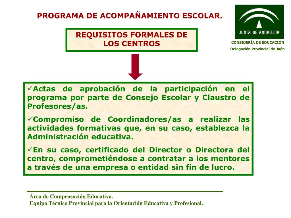 PROGRAMA DE ACOMPAÑAMIENTO ESCOLAR. REQUISITOS FORMALES DE LOS CENTROS CONSEJERÍA DE EDUCACIÓN Delegación Provincial de Jaén • Actas de aprobación de la participación en el programa por parte de Consejo Escolar y Claustro de Profesores/as. • Compromiso de Coordinadores/as a realizar las actividades formativas que, en su caso, establezca la Administración educativa. • En su caso, certificado del Director o Directora del centro, comprometiéndose a contratar a los mentores a través de una empresa o entidad sin fin de lucro. Área de Compensación Educativa. Equipo Técnico Provincial para la Orientación Educativa y Profesional.