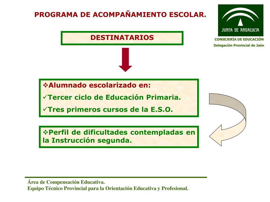 PROGRAMA DE ACOMPAÑAMIENTO ESCOLAR. DESTINATARIOS CONSEJERÍA DE EDUCACIÓN Delegación Provincial de Jaén • Alumnado escolarizado en: • Tercer ciclo de Educación Primaria. • Tres primeros cursos de la E.S.O. • Perfil de dificultades contempladas en la Instrucción segunda. Área de Compensación Educativa. Equipo Técnico Provincial para la Orientación Educativa y Profesional.