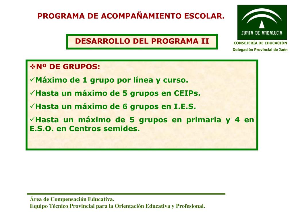 PROGRAMA DE ACOMPAÑAMIENTO ESCOLAR. DESARROLLO DEL PROGRAMA II CONSEJERÍA DE EDUCACIÓN Delegación Provincial de Jaén • Nº DE GRUPOS: • Máximo de 1 grupo por línea y curso. • Hasta un máximo de 5 grupos en CEIPs. • Hasta un máximo de 6 grupos en I.E.S. • Hasta un máximo de 5 grupos en primaria y 4 en E.S.O. en Centros semides. Área de Compensación Educativa. Equipo Técnico Provincial para la Orientación Educativa y Profesional.